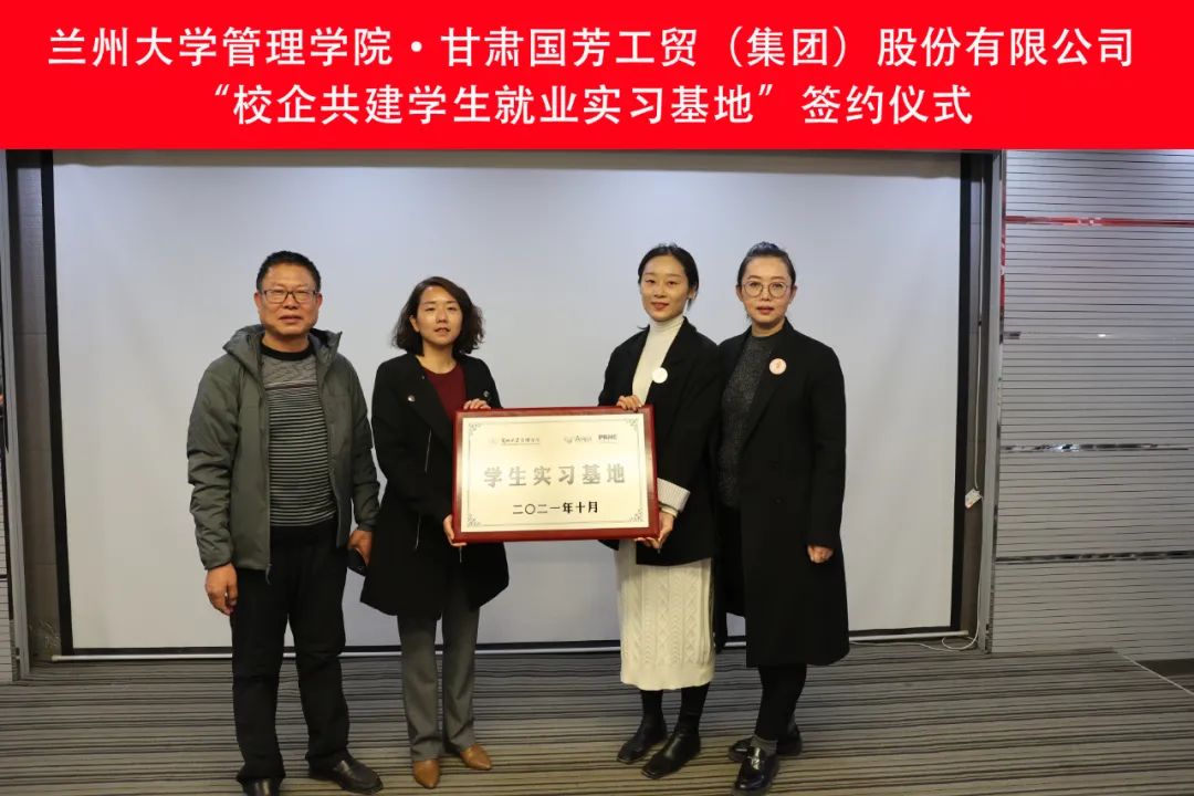 “校企合作,同道同行”,2021年10月15日上午,我司與蘭州大學管理學院舉行“校企共建學生就業(yè)實習基地”簽約儀式 ,在國芳寫字樓十五樓會議室舉行。國芳集團總經(jīng)理張輝女士、國芳集團總裁助理、人力資源總監(jiān)孟麗女士,蘭州大學管理學院黨委副書記李艷霞,蘭州大學管理學院團委書記魯靜,蘭州大學管理學院教師代表王懷詩,蘭州大學管理學院校友秘書易芊汝,以及國芳集團員工代表們出席了簽約授牌儀式。